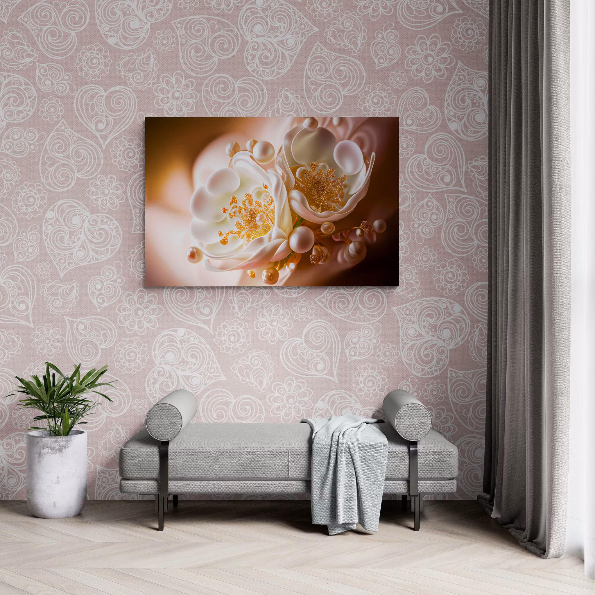 Hvite flotte blomster. Et veldig stilfullt bilde til en moderne stue.