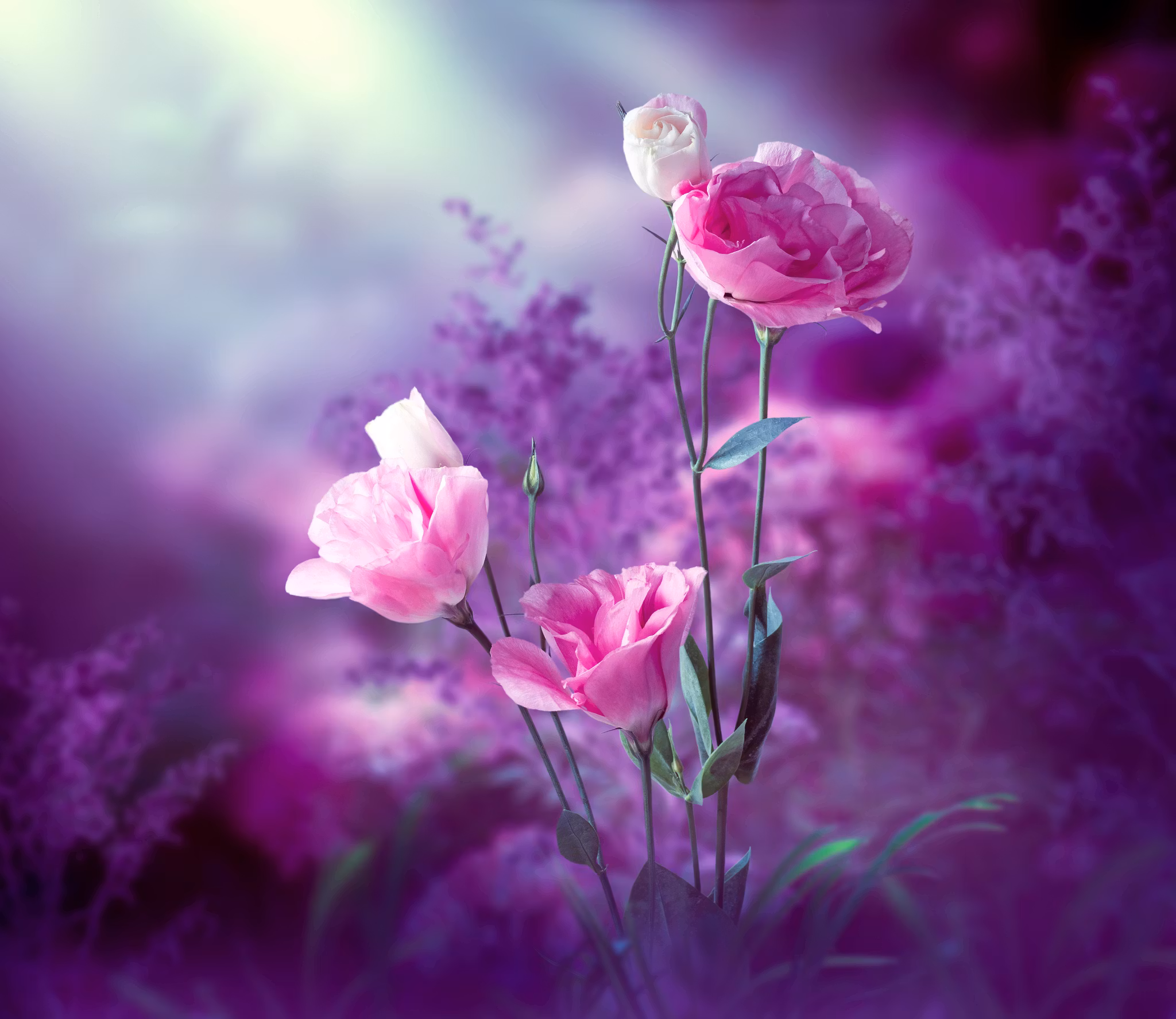 Eustoma blomt i en eventyr lignende blomster eng, og en en mørk bakgrunn som blir opplyst av månens lys.