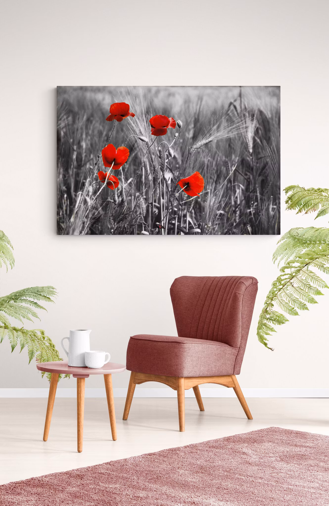 En blomstereng i sort/hvitt med røde blomster. Et bilde som blir veldig fint på lerretsramme. Fotograf : Ekstern.